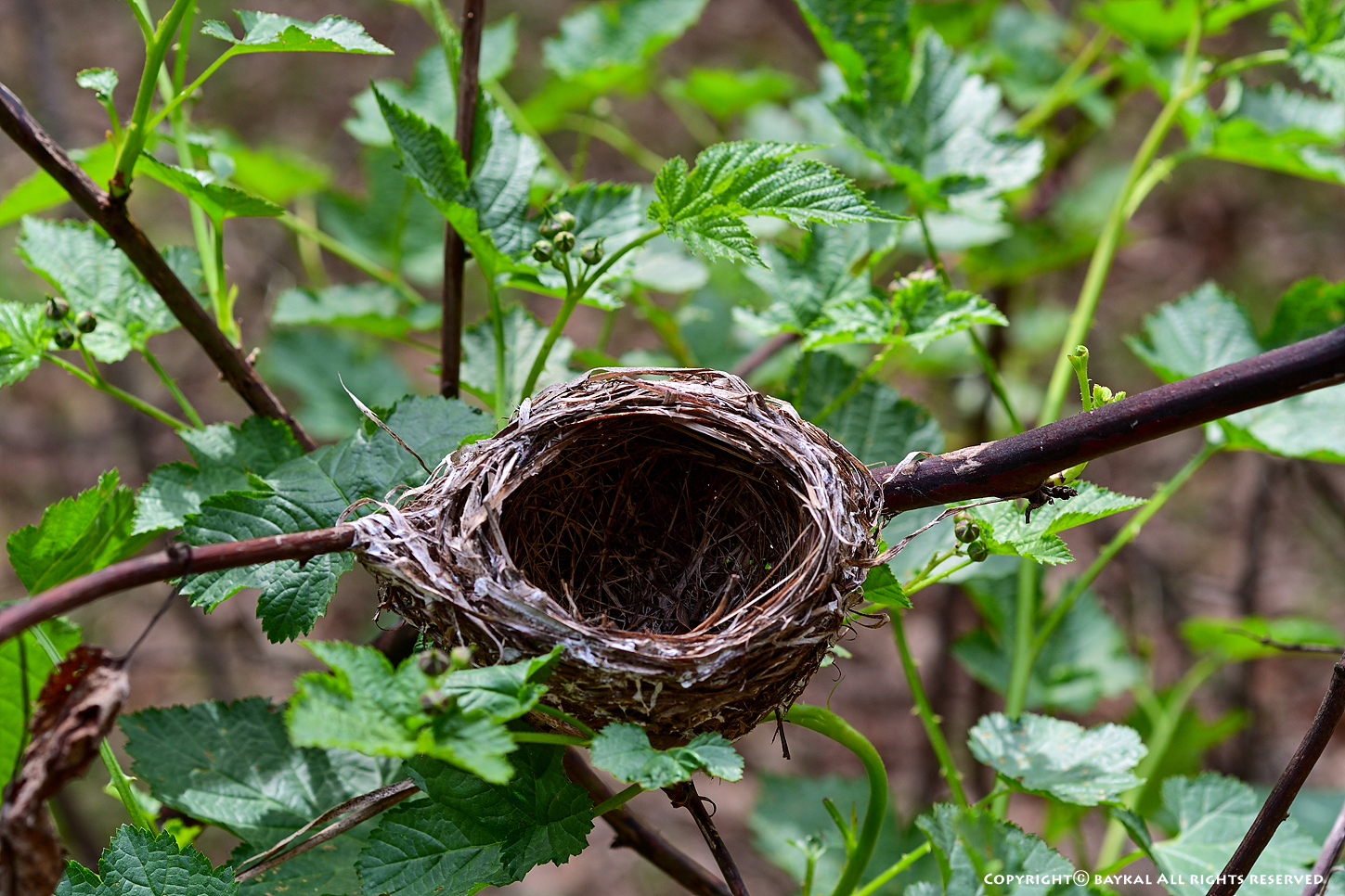 산딸기 나무가지 사이에 자리잡은 빈둥지