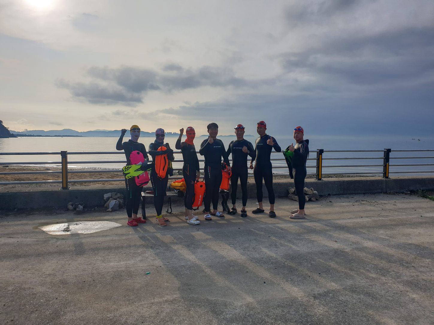 눌차 동선방조제 에서 진우도 앞 옷걸이 등대 까지 왕복 3.4km 이르는 바다 수영길 마침 간조시간 이라 바닥이 얕아서 수영 중간에 수심체크를 해보면 발이 닿는다